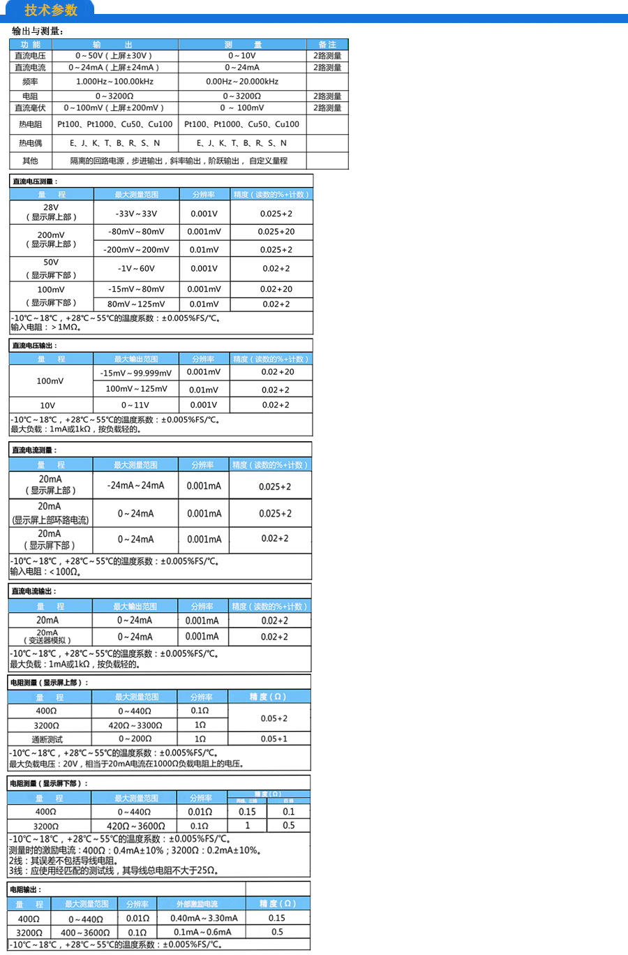 ● 测量/输出:电压、电流、频率、电阻,其中电流输出支持有源、无源;